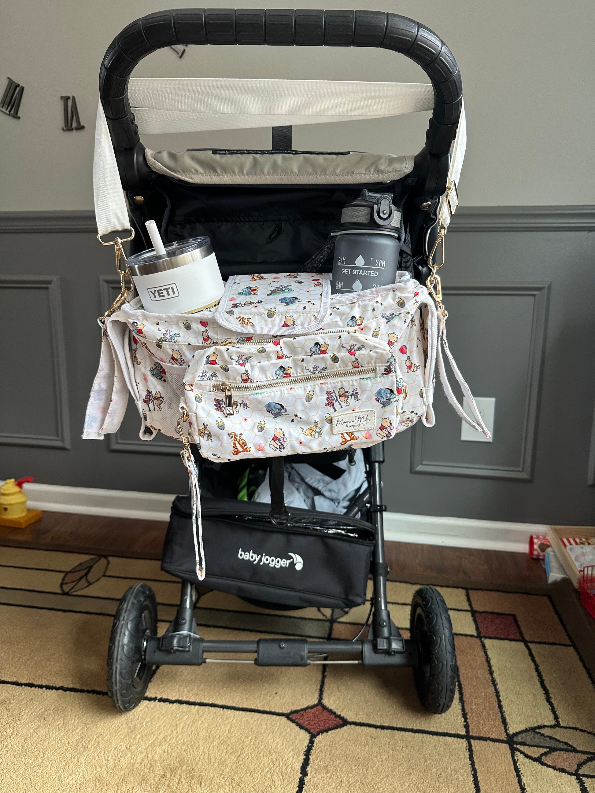 The perfect organizer for your long park days! This sturdy universal baby stroller organizer is equipped with 2 insulated cup holder with a diameter of 3.5 inches. 3 ways to attach to stroller- adjustable shoulder strap, adjustable Velcro tabs, stroller hooks. Detachable wristlet. Mesh cell phone pocket and a middle pocket with velco cover perfect for snacks!